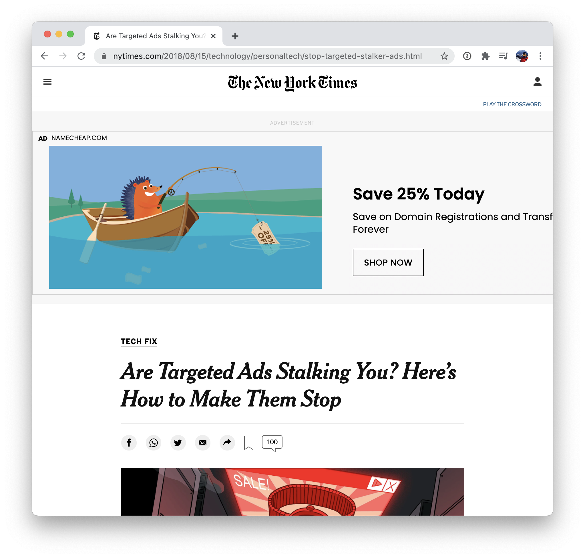 Speaking of which, admire the irony of this huge, half-page tracked ad (I recently purchased a domain name) above a New York Times article denouncing the same: